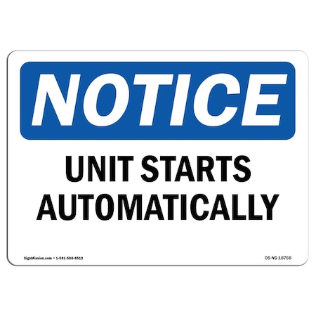 OSHA Notice Sign, Unit Starts Automatically, 5in X 3.5in Decal, 10PK