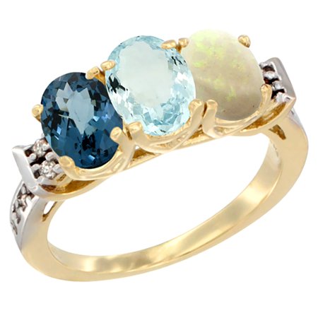 10K Yellow Gold Natural London Blue Topaz, Aquamarine & Opal Ring 3-Stone Oval 7x5 mm Diamond Accent, sizes 5 - 10