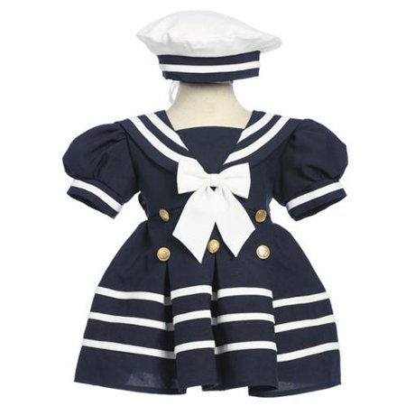 <ul> <li>Navy dress features white stripes, short puff sleeves</li> <li>Button on the waistline</li> <li>Fancy collar and bow accent</li> <li>Coordinating white hat with navy stripes complete the look</li> <li>Sizing is based on U.S. clothing size standards</li> </ul>