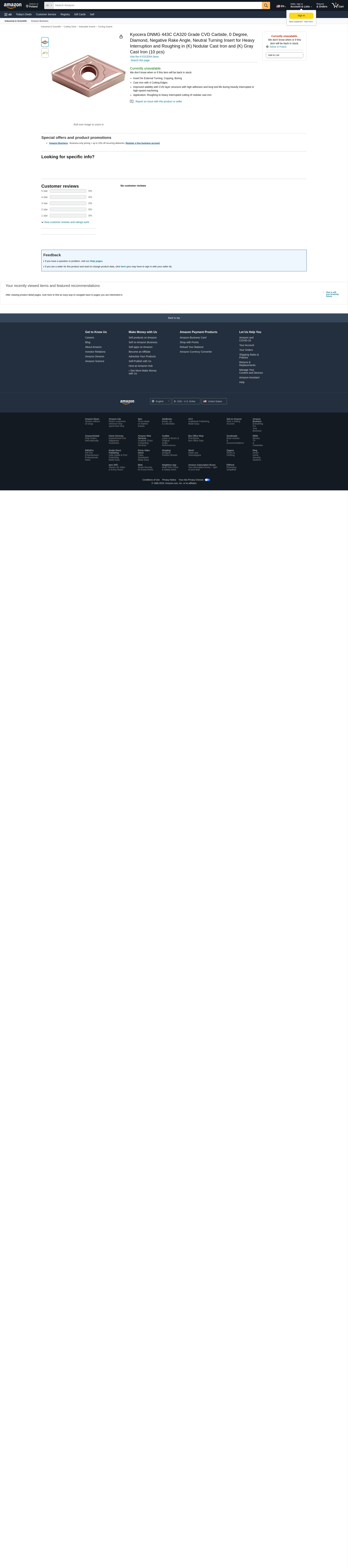 Kyocera DNMG 443C CA320 Grade CVD Carbide, 0 Degree, Diamond, Negative Rake Angle, Neutral Turning Insert for Heavy Interruption and Roughing in (K) Nodular Cast Iron and (K) Gray Cast Iron (10 pcs)