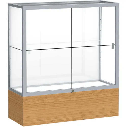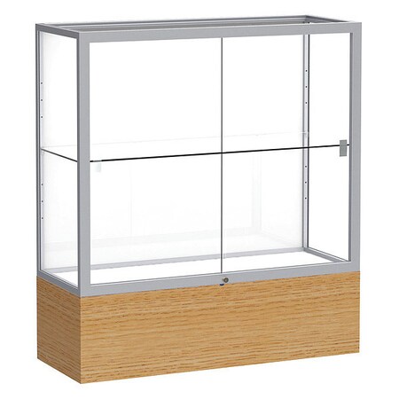2281WB-SN-AK Backing: White, Frame Finish: Satin, Wood Finish: Autumn Features: -Aluminum framed case. -Sliding tempered glass doors. -Reflective mirror back adds luster and class. -Sliding glass doors for easy access to contents. -Built in lock for security. -Reliant Series collection. Product Type: -Trophy display case. Style: -Floor standing. Display Material: -Glass. Country of Manufacture: -United States. Frame Material: -Metal. Adjustable Shelves: -Yes. Dimensions: Overall Height - Top to Bottom: -40". Overall Width - Side to Side: -36". Overall Depth - Front to Back: -14". Overall Product Weight: -118 lbs. Shelf Depth - Front to Back: -12".