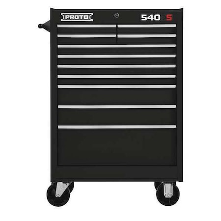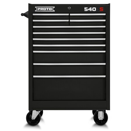 Technical Specification Item Rolling Cabinet Series 540S Width 27" Depth 18" Height 42" Number of Drawers 11 Color Black Drawer Capacity 200 lb. Drawer Slides Ball Bearing, Full Extension Storage Capacity 9410 cu in. Load Rating 1800 lb. Caster Size 5" x 2" Number of Shelves 0 Material Steel Gauge 18 Work Surface Material Steel/Vinyl Caster Wheel Material Polyurethane Caster Type (2) Fixed with Lock, (2) Swivel Locking System Heavy Duty Keys Handles Easy Grip Steel Configuration Left Bank: (2) 11-1/8" W x 16-1/8" D x 1-7/8" H, Right Bank: (2) 11-1/8" W x 16-1/8" D x 1-7/8" H, Center Bank: (4) 23-1/4" W x 16-1/8" D x 1-7/8" H, (2) 23-1/4" W x 16-1/8" D x 3-15/16" H, (1) 23-1/4" W x 16-1/8" D x 8-1/16" H Finish Gloss Features Fully Extending and Recessed Drawers, Adjustable Drawer Detents, Reinforced Top and Bottom Panels For Use With Proto 540 Series Includes Drawer Liners This listing is for each.