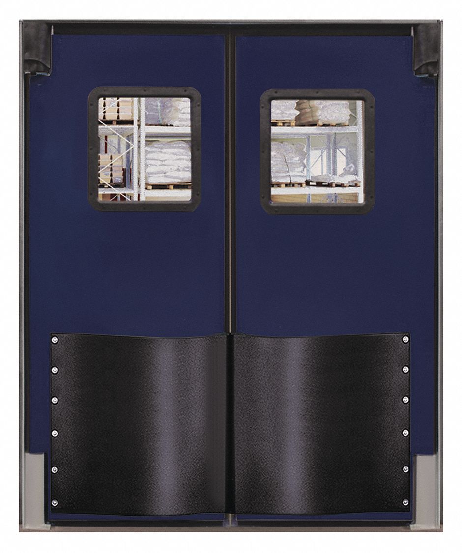 Swinging Door, Door Height 8 ft., Door Width 6 ft., Door Color Navy Blue, Swinging Door Material Polyethylene, Textured (Polyethylene Eggshell) Finish, Door Thickness 1-1/2 In., Number of Doors 2, Window Height 16 In., Window Width 16 In., Bumpers Included Yes, Door Seals Included Yes, Opening Height 8 ft., Opening Width 6 ft., Window Color Clear, Window Material Polycarbonate, Left and Right Jamb, Insulation Value 9.86, Standards NSF and USDA, Swinging Door Core Material Non-CFC Urethane Core Includes : 24 in Spring Bumpers, Mounting Hardware Window Material : Polycarbonate Window Color : Clear Opening Width : 6 ft Door Height : 8 ft Swinging Door Core Material : Non-CFC Urethane Core Item : Swinging Door Door Thickness : 1 1/2 in Window Width : 16 in Window Height : 16 in Insulation Value : 9.86 Door Seals Included : Yes Opening Height : 8 ft Hinges : Left and Right Jamb Door Material : One Piece Molded Polyethylene Number of Doors : 2 Door Width : 6 ft Bumpers Included : Yes Door Color : Navy Blue Swinging Door Material : Polyethylene Window Included : Yes Standards : NSF and USDA Finish : Textured (Polyethylene Eggshell) Country of Origin (subject to change) : United States
