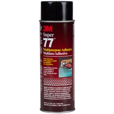 Fast-drying, transparent adhesive provides high coverage, low soak-in and long-bonding range 3M Spray Adhesive Type: Super 77 multi-purpose adhesive aerosol Size: 24 fl oz (Net wt 16-3/4 oz) Packaging Qty: 12 per case