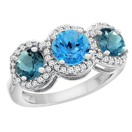 10K White Gold Natural Swiss Blue Topaz & London Blue Topaz Sides Round 3-stone Ring Diamond Accents, sizes 5 - 10