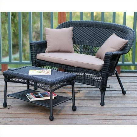 Jeco Wicker Patio Love Seat and Coffee Table Set in Black with Brown Cushion