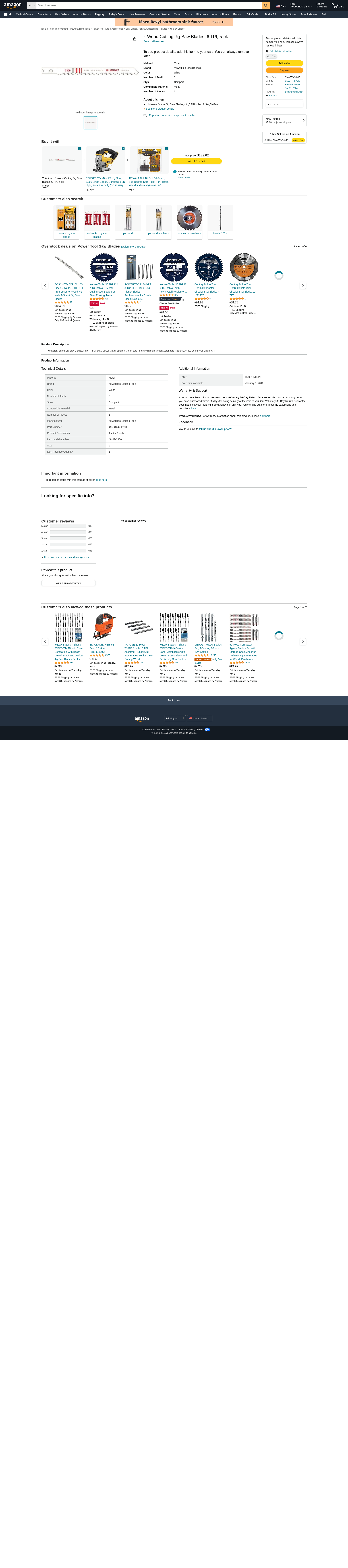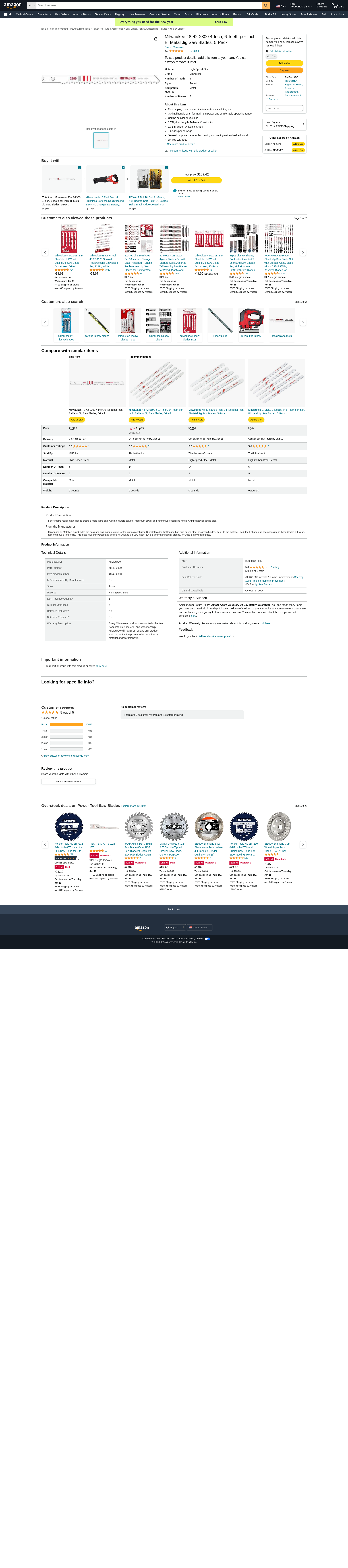 Milwaukee 48-42-2300 4-Inch, 6 Teeth per Inch, Bi-Metal Jig Saw Blades, 5-Pack