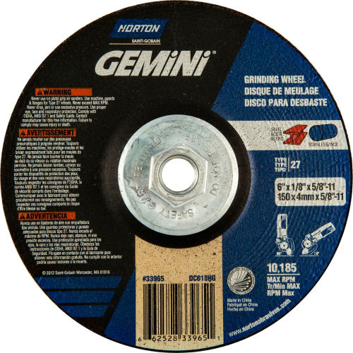 The NORTON Type 27 general-purpose grinding and cutting wheel has an aluminum oxide abrasive for cutting ferrous metals, gray iron, and stainless steel.<br /><br /> Item: Depressed Center Wheels<br /> Abrasive Wheel Type: Type 27<br /> Abrasive Wheel Diameter: 6"<br /> Thickness: 1/8"<br /> Arbor Hole Size: 5/8"-11<br /> Abrasive Material: Aluminum Oxide<br /> Abrasive Grit: 24<br /> Max. RPM: 10,185<br /> Series: Gemini<br /> Grade: Extra Coarse<br /> Application: Ferrous Metal, Gray Iron, Stainless<br />