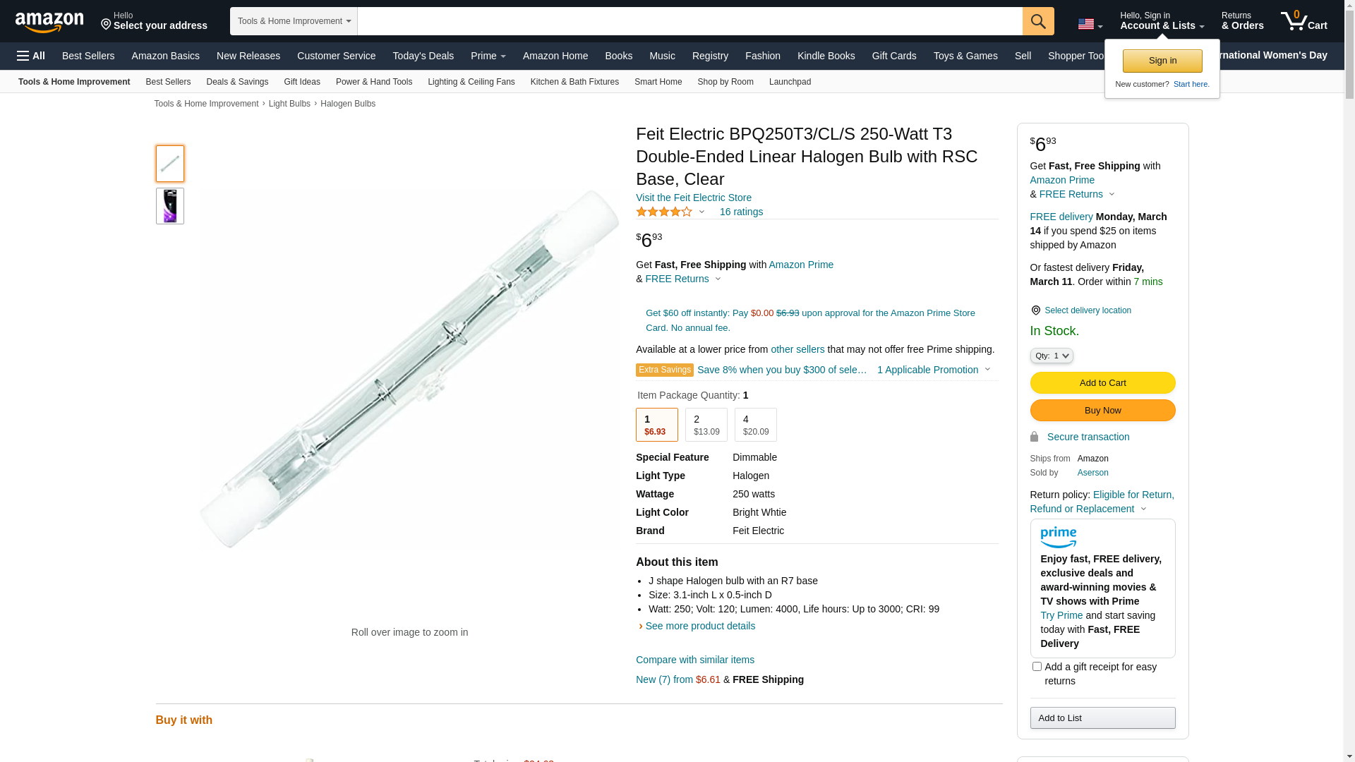 Feit Electric BPQ250T3/CL/S 250-Watt T3 Double-Ended Linear Halogen Bulb with RSC Base, Clear