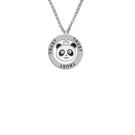 Silver Tone Enamel Panda Face Trust Affirmation Ring Necklace. Silver Tone Charm. Charm size is approx. 0.53 x 0.54 x 0.08 inches (HxWxD) including loop. Silver tone 2mm Belcher Chain Necklace is approx. 23 Inches with a Lobster Claw Clasp. Affirmation Ring is approx. 0.86 x 0.86 x 0.05 (HxWxD). This inspirational piece of jewelry is very meaningful. Its circular shape is symbolic for endless belief in the message that is imprinted around the ring. These are motivational or sentimental messages to the wearer. Makes a great team gift! PLEASE NOTE: Our products are lead safe, but are not intended for children 14 years and younger.