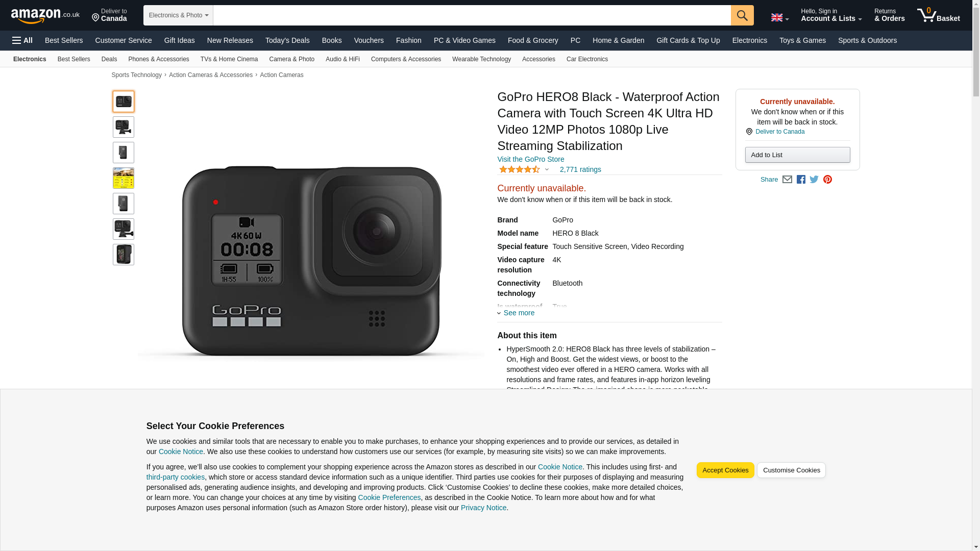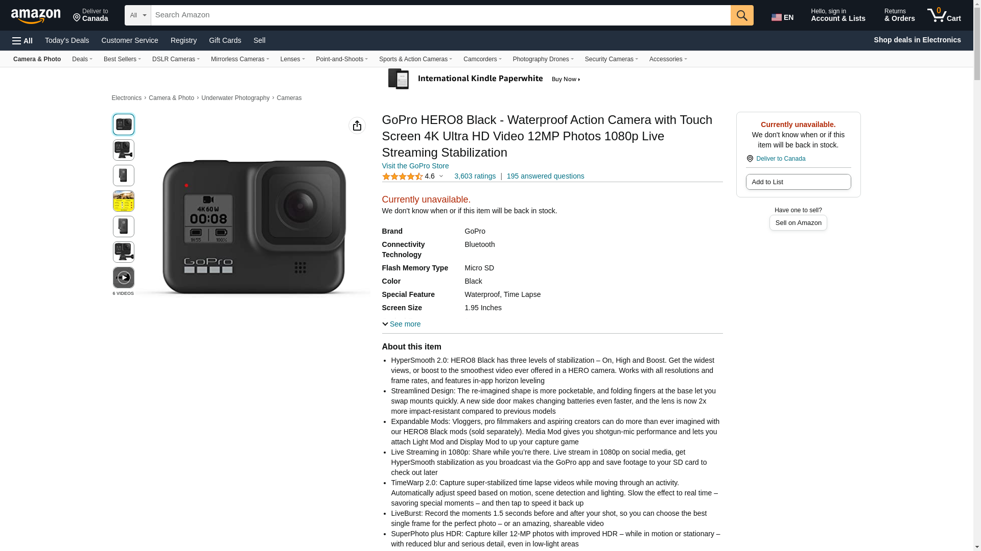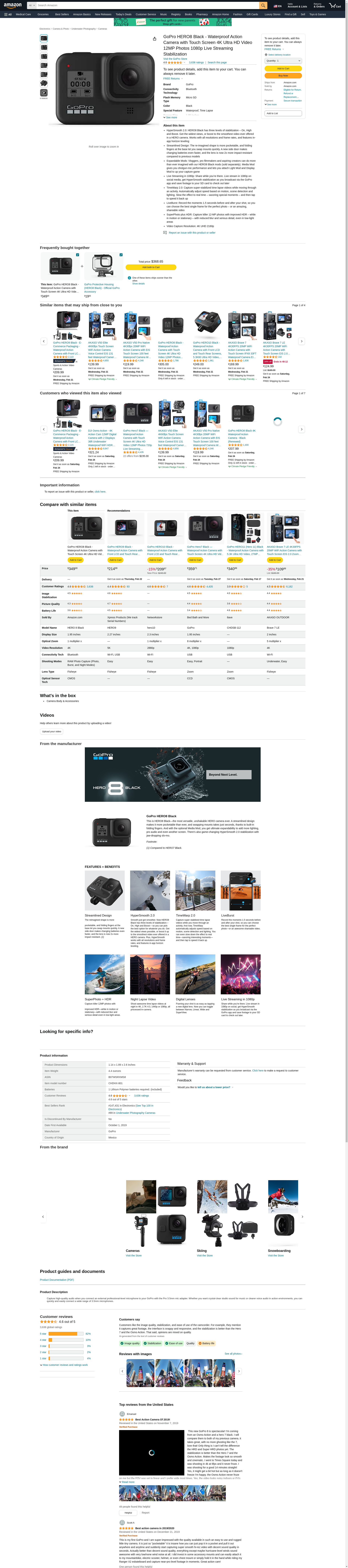 GoPro augments its already impressive action camera line with the HERO8 Black, the versatile next-generation action cam designed to capture smooth, stable footage of your latest adventure, from a simple boat trip to a wild jump-off-a-mountain ride. The HERO8 Black features updated HyperSmooth 2.0 stabilization to produce smooth, gimbal-like movement at all supported frame rates, without the need for a gimbal. Additional updates include a sleeker physical design with a ""folding fingers"" type base for fast mounting, a redesigned battery door for quicker battery changes, a lens with twice the impact resistance as the HERO7, an optional Battery Mod for nearly 2.5x more battery life, an optional flip-up Display Mod to make viewing your frame easier, an optional LED Light Mod, and an optional Media Mod to expand your accessory possibilities. Manufacturer Included Items: GoPro HERO8 Black<br/>Rechargeable Battery<br/>Curved Adhesive Mount<br/>Mounting Buckle<br/>Thumbscrew<br/>USB-C Cable<br/>Limited 1-Year Warranty Bundle Items Include:<br/><br/>GoPro HERO8 Black<br/>Chest Strap<br/>Bicycle Handlebar<br/>Handheld Monopod<br/>Head Strap Mount<br/>Helmet Strap Mount<br/>Microfiber Cloth<br/>Collection Carrying Case