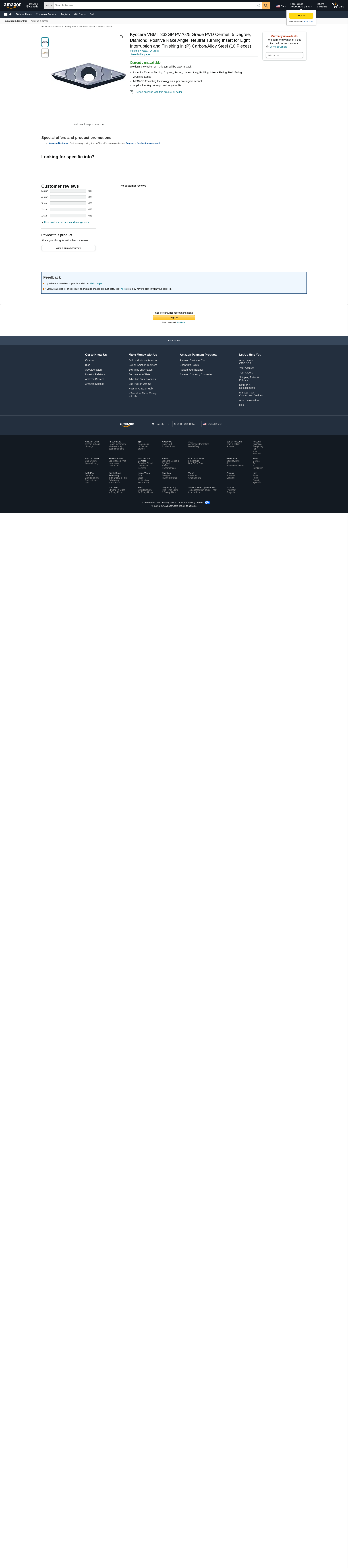 Kyocera VBMT 332GP PV7025 Grade PVD Cermet, 5 Degree, Diamond, Positive Rake Angle, Neutral Turning Insert for Light Interruption and Finishing in (P) Carbon/Alloy Steel (10 Pieces)