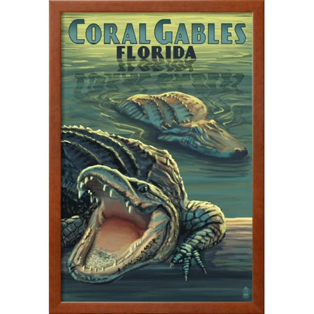 <ul> <li>Title: Coral Gables, Florida - Alligators</li> <li>Artist: Lantern Press</li> <li>Product Type: Framed Art Print</li> <li>Framed in SOHO Pecan</li> <li>Arrives ready-to-hang for fast, simple installation</li> <li>Framed Size: 22x32 in.</li> <li>Handcrafted in the USA</li> </ul>