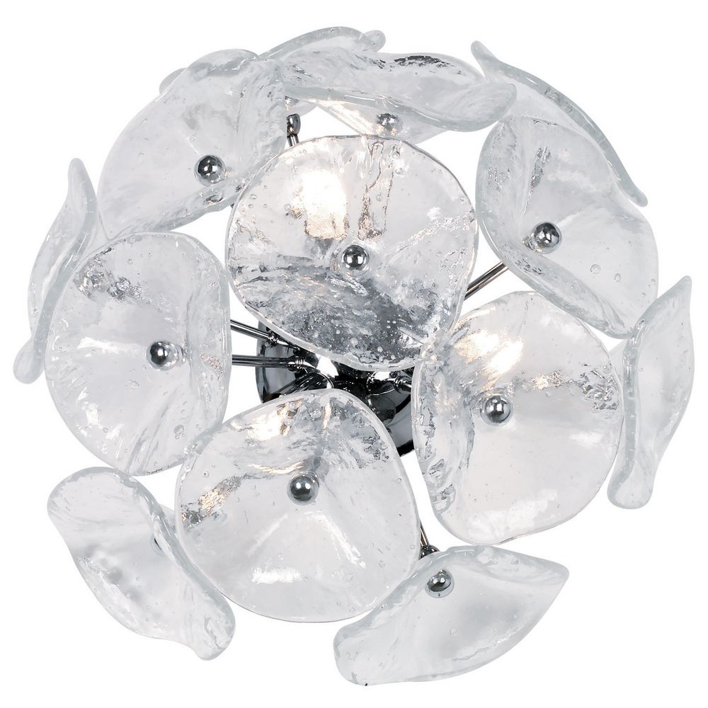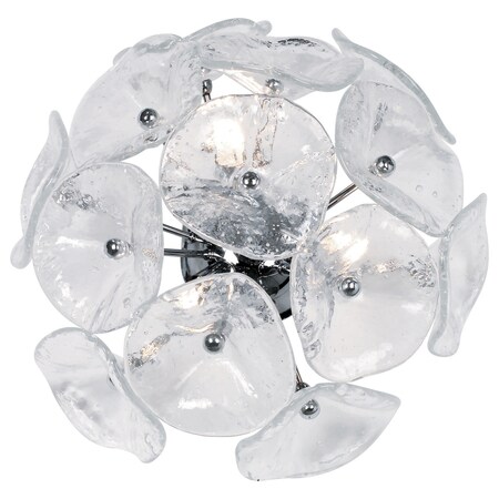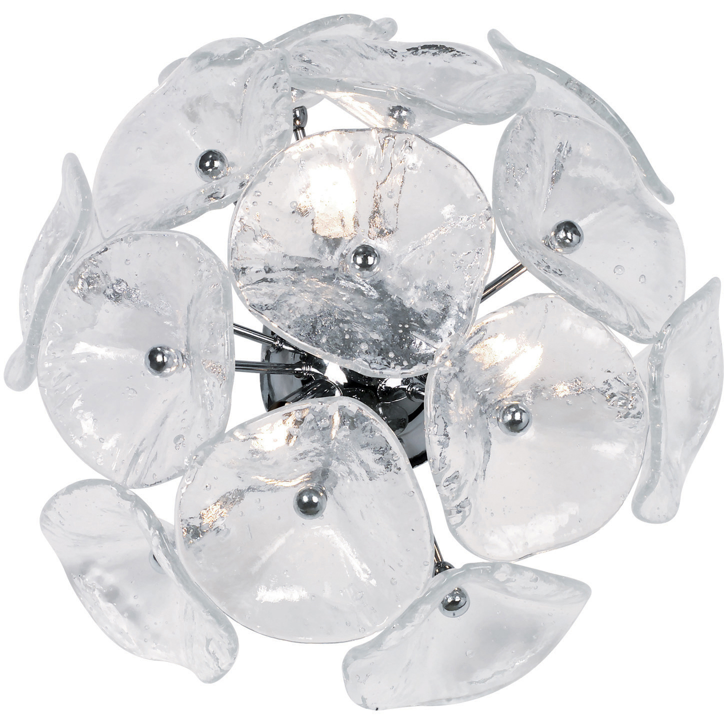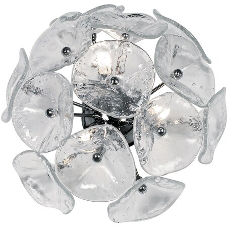 ET2 Lighting-E22091-28-Collection: Fiori, Material: Glass, Finish Color: Polished Chrome, Width: 14.25", Height: 7.5", Length: 16", Depth: 7.5", Height From Outlet Box: 7.75", Backplate Width: 5", Backplate Length: 5", Lamping Type: Xenon, Number Of Bulbs: 3, Wattage: 40 Watts, Dimmable: No, Moisture Rating: Dry Rated, Desc: The Fiori Collection boasts of a contemporary design fused with historic craftsmanship. A floral sphere, comprised with hand formed Murano glass crystal petals, is eloquently designed in an amazing combination of glass and chrome while delivering an amazing glow of light. The result is a fixture that will definitely make a statement in any design space. Warranty: 1 YearColor Temperature: 2900 / Lumens: 1500 / Rated Life: 2000 Hours / Mounting Direction: All / Canopy Included: Yes / Shade Included: Yes / Canopy Diameter: 5 x 5. ,-Fiori-3 Light Flush/Wall Mount in Leaf style-14.25 Inches wide by 7.5 inches high