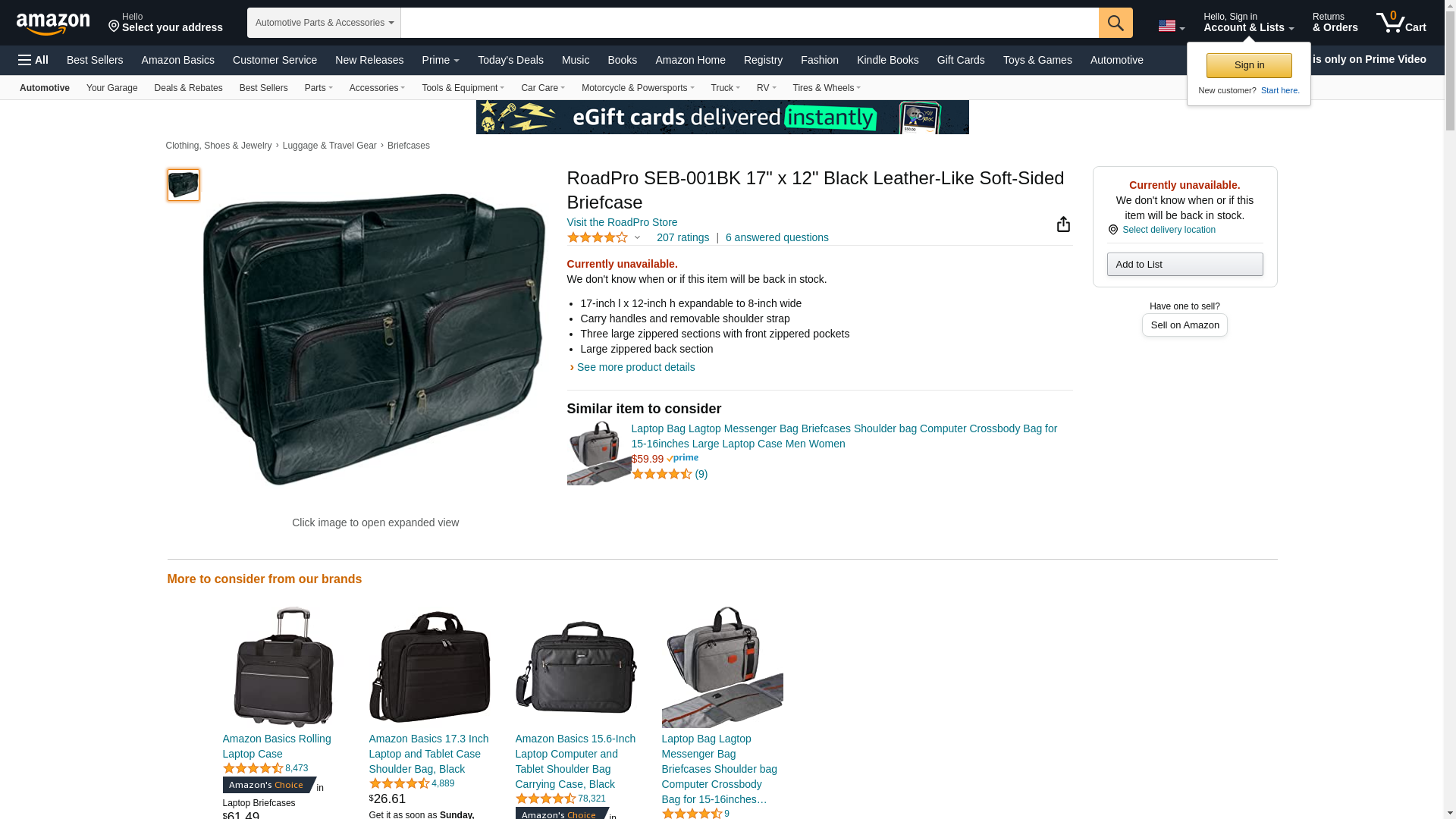 RoadPro SEB-001BK 17 x 12 Leather-Like Soft-Sided Briefcase - Black - 12Volt-Travel®