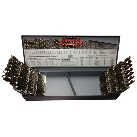 - Size: Set, Material: Cobalt, Finish: Gold, Shank Type: Round, Style: Jobber, Cutting Angle: 135, Point Type: Split Point, Number of Flutes: 2, Cutting Direction: Right Hand, Pieces in Set: 115