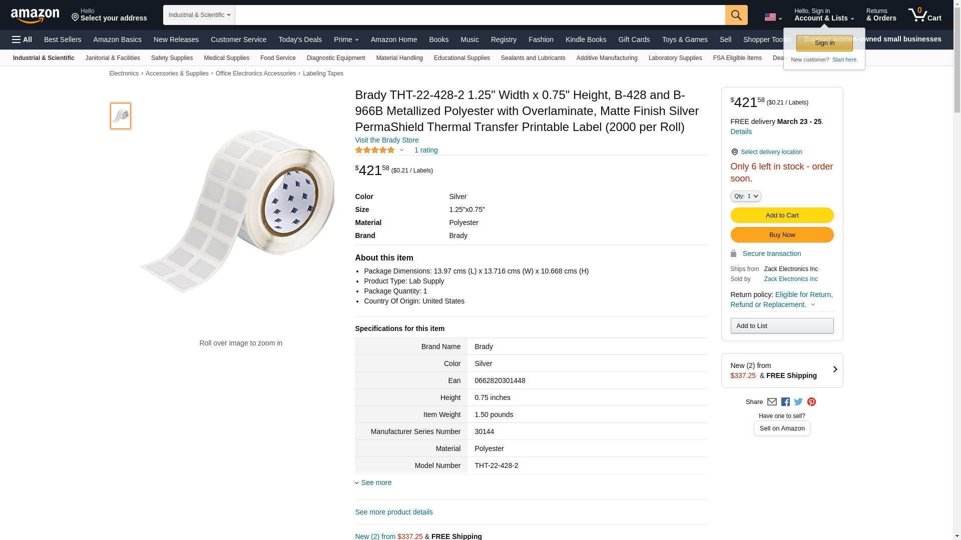 BRADY THT-22-428-2 3" Core 0.75 x 1.25 inch Metallized Polyester Overlaminate Metal Label Roll - 1 item(s)