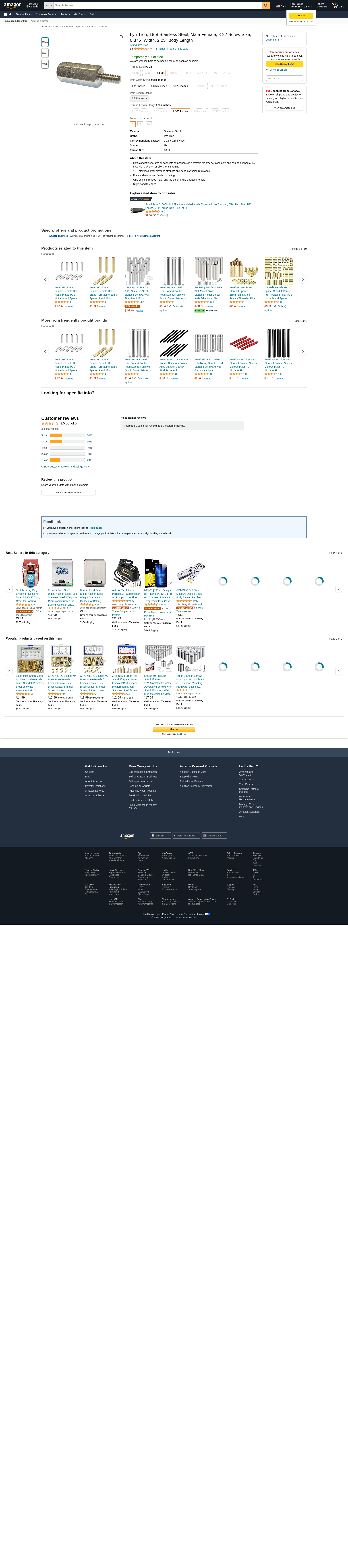 Lyn-Tron, 18-8 Stainless Steel, Male-Female, 8-32 Screw Size, 0.375" Width, 2.25" Body Length