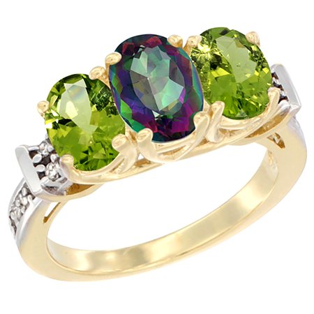 10K Yellow Gold Natural Mystic Topaz & Peridot Sides Ring 3-Stone Oval Diamond Accent, sizes 5 - 10