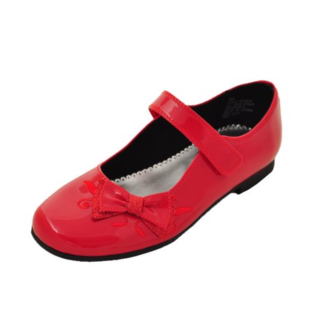 <ul> <li>Rachel Mary Jane shoes</li> <li>Patent construction</li> <li>Glittery bow accent at toe</li> <li>Hook-and-loop strap</li> <li>Grippy sole with slight heel</li> </ul>