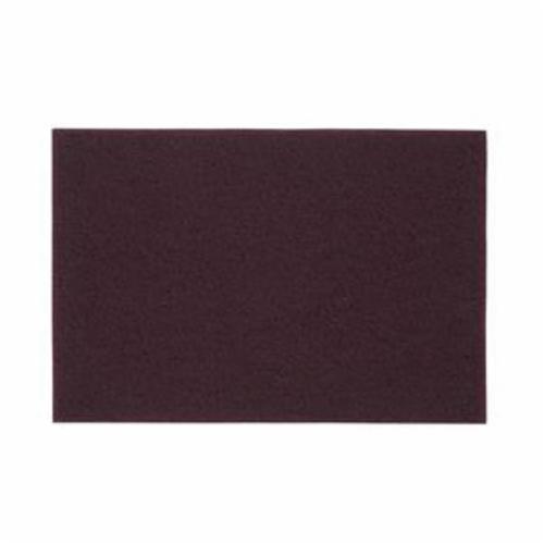Ideal for hand sanding, this pad is made of nonwoven nylon web impregnated with abrasive. It has a fast initial cut rate. The flexible construction conforms to work surfaces. The gentle action deburrs, cleans, and polishes without affecting dimensions or workpieces. Nonmetallic and waterproof, the pad will not rust, making it an alternative to steel wool. It's ideal for corrosion and oxidation removal. The open construction prevents loading.<br /><br /> Item: Sanding Hand Pad<br /> Length: 9"<br /> Width: 6"<br /> Abrasive Type: Non-Woven<br /> Abrasive Material: Aluminum Oxide<br /> Grit: 240 - 360<br /> Grade: Very Fine<br /> Series: 777<br /> Color: Maroon<br /> Function: Fast initial cut rate, Cleaning, Deburring, Crrosion removal, Oxidation removal