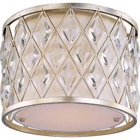 Maxim Lighting 21451OFGS Features: -Flush mount. -Golden silver finish. -Creamy Off White fabric shade. -Diamond shape crystals with metal frame. Specifications: -Accommodates (1) 100W medium base incandescent bulb (not included). -Overall dimensions: 9.5" H x 12.5" W.