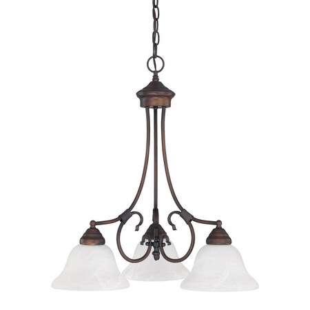 Features Fixture is constructed of metal and glass Fixture includes frosted glass shades (3) 100 watt maximum medium (E26) Incandescent bulbs required UL rated for dry locations Covered under a 1 Year manufacturer Dimensions Fixture Height: 23" Minimum Height: 26-3/4" Maximum Hanging Height: 147-1/2" Width: 22" Product Weight: 8.5 lbs Chain Length: 120" Wire Length: 180" Canopy Height: 1" Canopy Width: 5" Electrical Specifications Number of Bulbs: 3 Max Watts Per Bulb: 100 watts Bulb Base: Medium (E26) Bulb Type: Incandescent Bulbs Included: No