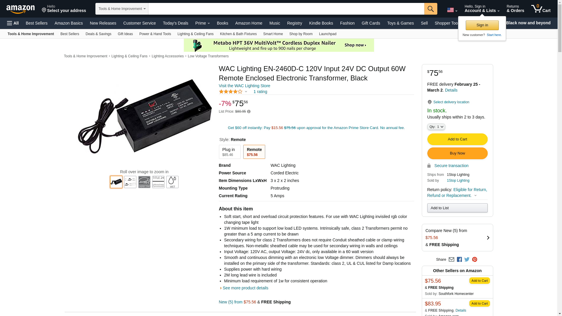 WAC Lighting EN-2460D-C 120V Input 24V DC Output 60W Remote Enclosed Electronic Transformer, Black