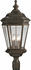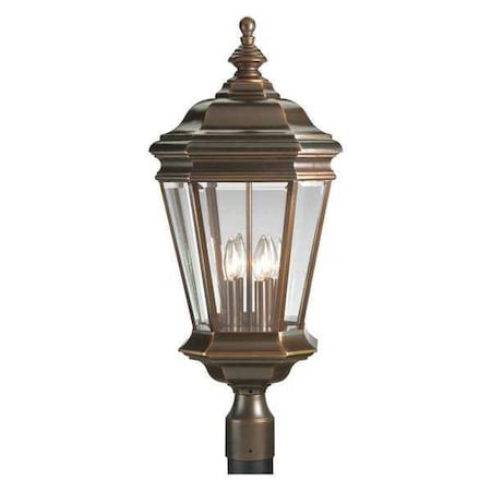 Four-light cast post mount lantern with water patterned glass and scroll arm details. Bulbs Included: FALSE Product Weight: 18 Product Color: Brown Lamp Wattage: 60 Glass: Clear beveled Weight: 18 Notes: Fits 3 in. post (sold separately)