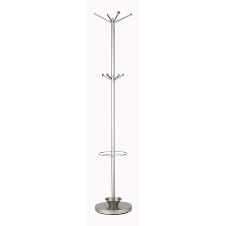 DETAILS Hang coats and umbrellas in the entryway with this versatile coat rack, featuring 8 coat hooks and a champagne powder coated steel finish. Product: Coat Rack Material: Metal Features: Champagne powder coated steel finish Shiny chrome accents Eight coat hooks Metal cup on top of base to catch water from dripping umbrellas Top hooks: 14" Diameter Umbrella ring: 10" Diameter Weighted base: 13" Diameter Dimension: 70" Height. SHIPPING INFORMATION Estimated to Ship In: Ships in 3-5 business days Ships to: Worldwide Ships Via: FedEx Shipping Description: This item ships Fedex. Delivery typically takes place between 1 and 5 business days after shipment. Return Policy: 14 Day Money Back Guarantee.