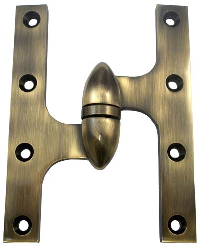 Highlights: Finish: Antique Brass Material: Solid Brass Size: 6" x 4-1/2" Wood Screw: #12 x 1-1/4" Design: Olive Knuckle Handing: Left Hand Full Mortise Versatile application to all kinds of doors and cabinets