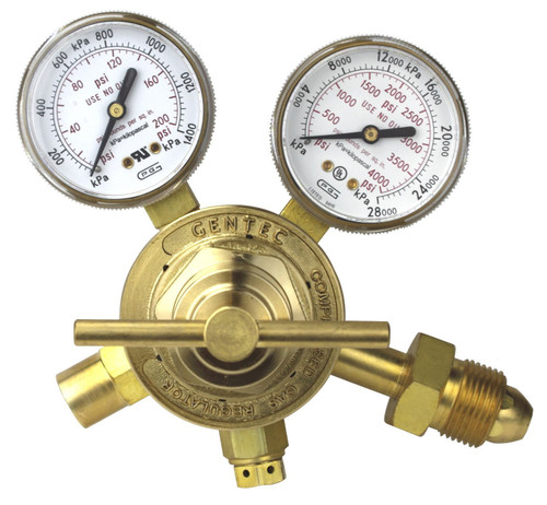 Gentec 152 Series is Designed for medium duty gas welding, cutting, and heating applications. These regulators are ideal for industrial applications, farm repairs and laboratory testing, etc. CGA580, 5/8in-18RHF, Gas: Inert. Forged brass body and housing cap Delrin cap bushing for smooth adjustments Self re-seating external pressure relief valve on oxygen, inert gas, and air models Sintered bronze inlet filter Stem-type seat assembly for more reliable performance 2in gauges for easy reading 2in diaphragm Steel Gauge Protectors are color coded: green for Oxygen GP21X and red for Acetylene GP21Y Weight: 2 lbs 11 oz UL Listed