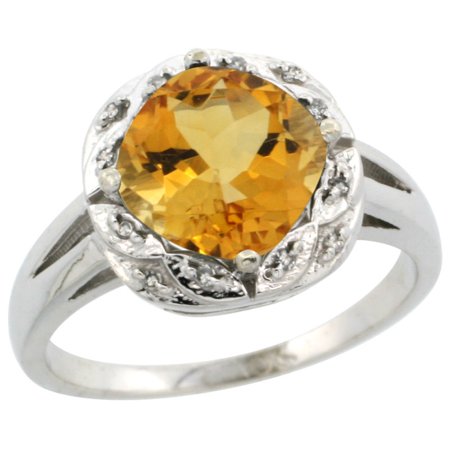 10k White Gold Natural Citrine Ring Cushion-cut 8x8mm Diamond Halo, sizes 5-10