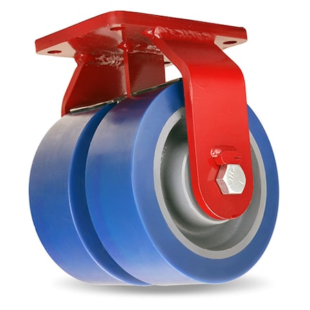 These forged steel dual wheel casters are built on the reliable Extra Heavy Duty (EHD) swivel caster platforms, which means flexibility if you need to match an existing bolthole pattern or overall height dimension. Dual wheel casters address the problem of how to minimize overall height and maximize load capacity on resilient tread wheels. Dual wheel casters also improve stability and swivel more easily than wider-face single wheels because differential action reduces the "scrubbing" effect of soft treads against the floors. All models have forged steel mounting plate and horn base with 1" integrally forged kingpins and precision tapered thrust bearings. Legs are 3/8" thick. Main Load Bearing - large diameter raceway CNC-machined for HPIa,, Swivel Technology. Secondary Load Bearing - precision tapered roller bearing capped with grease retainer.