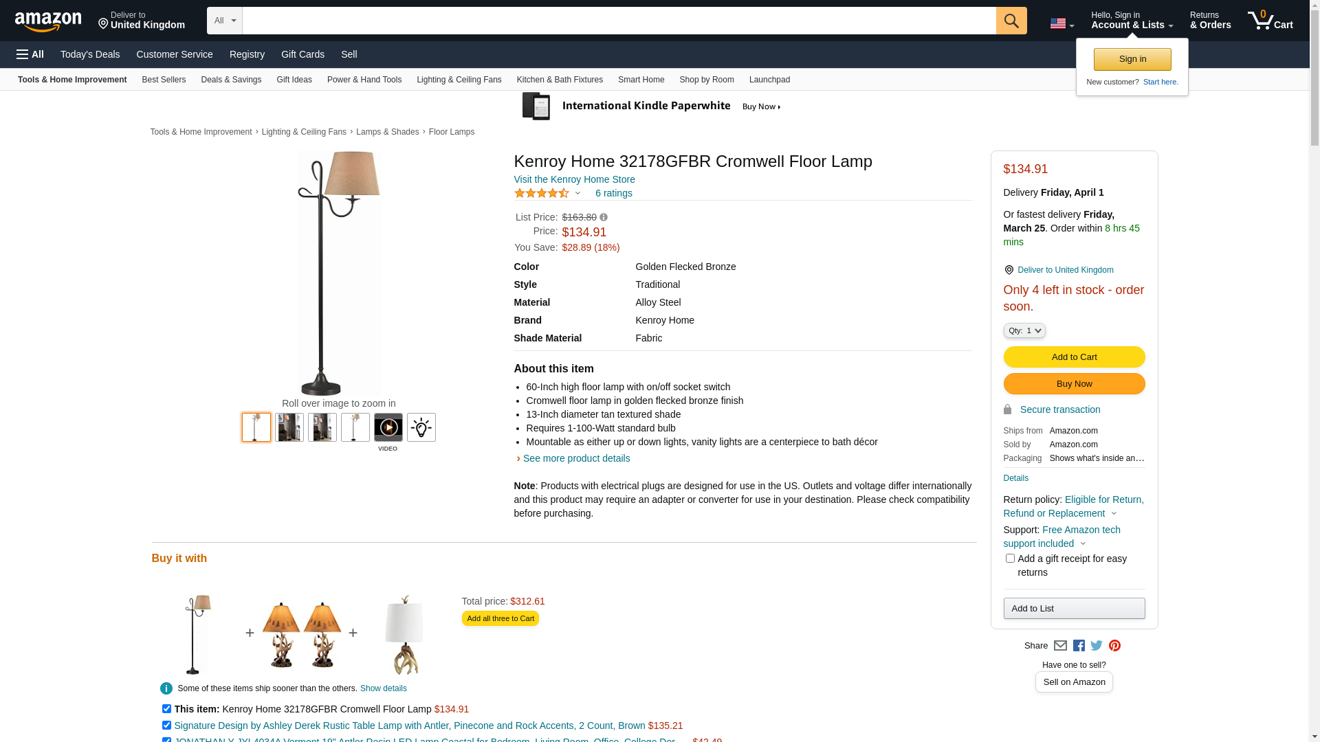 Kenroy Home 32178GFBR Cromwell Floor Lamp with Golden Flecked Bronze Finish, Casual Style, 60" Height, 13" Width, 20" Depth