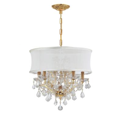 4415-GD-SMW-CLM Finish: Gold, Crystal Type: Majestic Wood Polished Shown in polished chrome Features: -Six light chandelier.-Antique white silk shade.-Traditional lighting designs.-UL and cUL listed.-Majestic Wood Polished.-Swarovski Spectra.-Swarovski Strass. Construction: -Steel construction. Color/Finish: -Polished chrome finish.-Gold finish. Specifications: -Accommodates (6) 60W candelabra base bulb. Dimensions: -Chain length: 72''.-Wire length: 120''.-Overall dimensions: 19'' - 94'' H x 20'' W. Collection: -Brentwood collection.