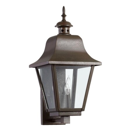 7030-3-86 Features: -Outdoor wall light.-Number of lights: 3.-Transitional style.-Diffuser panels: 4.-Extension: 11.75". Color/Finish: -Finish: Oiled bronze.-Shade color: Clear. Specifications: -Bulb type: 60W candelabra. Dimensions: -Overall dimensions: 23" H x 10.75" W. Collection: -Bishop collection.