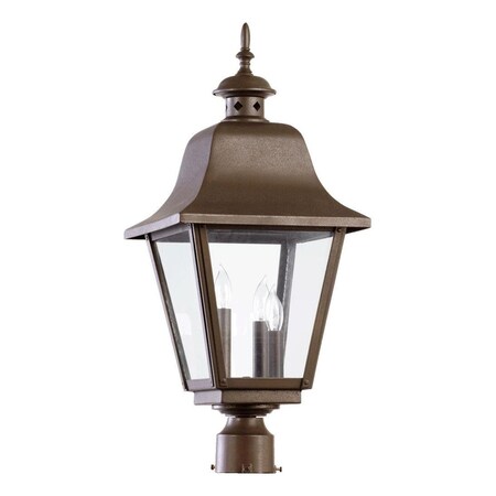 7032-3-86 Features: -Outdoor post lantern.-Number of lights: 3.-Transitional style.-Diffuser panels: 4. Color/Finish: -Finish: Oiled bronze.-Shade color: Clear. Specifications: -Bulb type: 60W candelabra. Dimensions: -Overall dimensions: 24.5" H x 10.75" W. Collection: -Bishop collection.