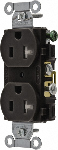 Hubbell Wiring Specification Grade Traditional Tamper Resistant straight blade duplex receptacle in black color features current rating of 20 Amps and voltage rating of 125 Volts. Screw mounted 2-Pole 3-wire receptacle is made of nylon and measures 1.320 Inch x 0.830 Inch x 3.280 Inch and is used for commercial purpose. Durable construction receptacle features single tab break off ears with self-grounding staple and wrap-around galvanized steel straps. It also has 14-12 AWG wire with 2500 wattag