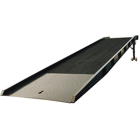 The Portable Steel Yard Ramp quickly loads and unload trucks, trailers and rail cars from ground level when no freight dock exists. Increase productivity while reducing material handling costs. Great for construction sites. A manual two-speed hand crank for easy one (1) person height adjustment. The standard features include: positive traction open steel grating, safety locking chains, rubber bumpers and fork positioning loop. Painted neutral earth-tone brown. Includes landing gear and crank mechanism. Limited Warranty: 1 year. Uniform Capacity (lbs.): 20000, Overall Ramp Width (in.): 73, Usable Ramp Width (in.): 66, Caster Material: Steel, Caster Diameter (in.): 8-5/8, Caster Width (in.): 3-5/8, Safety Curb (in.): 4, Usable Lip Support Edge (in.)