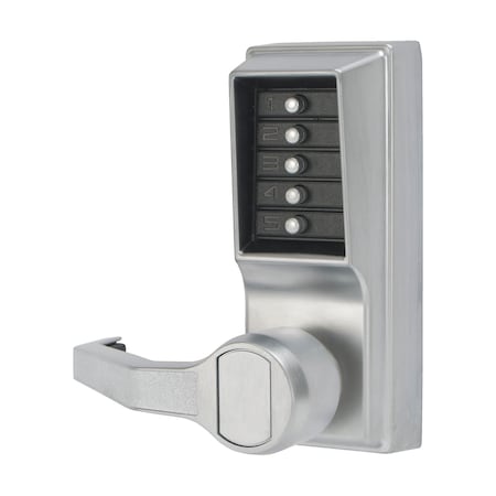 ' Mechanical Push Button Lockset, Handle Type Lever, Function Entry, Key Override Options None, Hand Left, Finish Satin Chrome, Door Thickness 1-3/8 In. to 2-1/4 In., Keypad 5 Button, Vandal Resistant, Backset 2-3/4 In., ADA Compliant Yes, 3 hr. Fire Rated, Case Material Zinc, Series L1000, Latch Length 1/2 In., Max. User Codes 1, Standards ANSI 156.2, Weather Resistant Yes, Includes Lock, Template, Manual, Required Installation Hardware, Code Change Plug and Access Key '