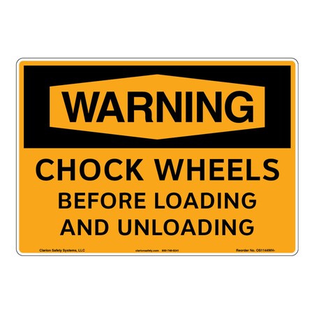 <p><strong>Word Message: </strong><br />CHOCK WHEELS BEFORE LOADING AND UNLOADING</p><p><strong>Description: </strong><br />Clarion Safety Systems brings you Warning Chock Wheels safety signs (OS1144WH-) which are produced on premium plastic or aluminum material and are designed to meet your OSHA safety sign needs.<p><strong>Material Information:</strong></p> <ul> <li><strong>Material</strong>: (S4) Outdoor Weather Tuff Aluminum</li> <li><strong>Base Materials</strong>: .040" Rigid White Aluminum</li> <li><strong>Overlaminate</strong>: 3M .003 Ultra-Clear WeatherTuff UV resistant</li> <li><strong>Mounting Option</strong>: Mounting holes</li> <li><strong>Application</strong>: Indoor/Outdoor</li> <li><strong>MaxTemp</strong> (F): 175</li> <li><strong>MinTemp</strong> (F): -40</li> <li><strong>Chemical Resistance</strong>: Excellent</li> <li><strong>UV Resistance</strong>: Excellent</li> <li><strong>Outdoor durability</strong>: Excellent</li> <li><strong>Storage Stability</strong>: Stable. Optimum storage conditions: 72 F @ 50% relative humidity</li> <li><strong>Expected Life Indoor</strong>: Long term</li> <li><strong>Expected Life Outdoor</strong>: 5 - 10 years (expected outdoor life may vary due to climatic conditions)</li> <li><strong>RoHS</strong>: No</li> <li><strong>CRoHS</strong>: No</li> <li><strong>REACH</strong>: No</li> </ul>
