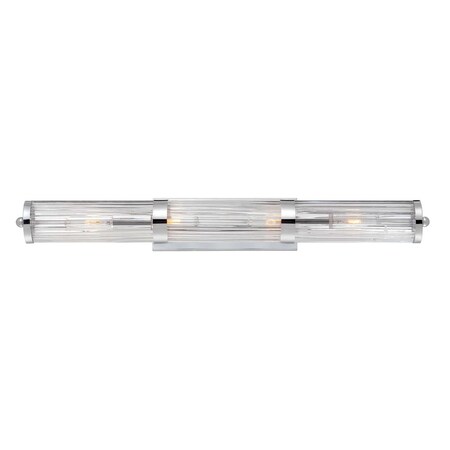 Lombard 4 light bath bar. Savoy House presents the Lombard Bath collection, from designer Brian Thomas. Curved clear glass has deep ribs that capture the light and sparkle against the polished chrome finish<br><br> Finish: Polished chrome<br> Bulb wattage: 60<br> Glass: Clear<br> Number of bulbs: 4<br> Type of bulb: E<br> Extends length: 3.75<br> Bulbs included: No<br> Back plate width: 5.00<br> Back plate height: 0.50<br> Safety rating: UL, CUL<br> Voltage: 120<br> Dimensions (in): 34.25W x 4.5H<br> Weight (lbs): 11.30 <br>