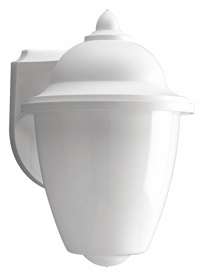 P5881-30WB Finish: White Features: -Wall lantern.-Number of lights: 1.-Socket base: 4 Pin quad.-Eco friendly. Specifications: -Bulb type: 18W CFL bulb. Dimensions: -Overall dimensions: 8.88" H x 6" W x 6.88" D.