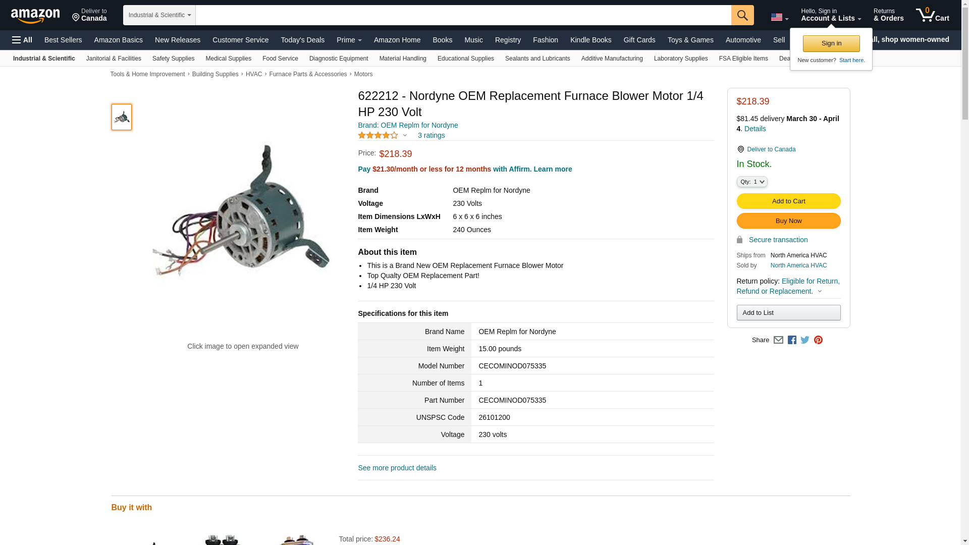 622212 - Nordyne OEM Replacement Furnace Blower Motor 1/4 HP 230 Volt