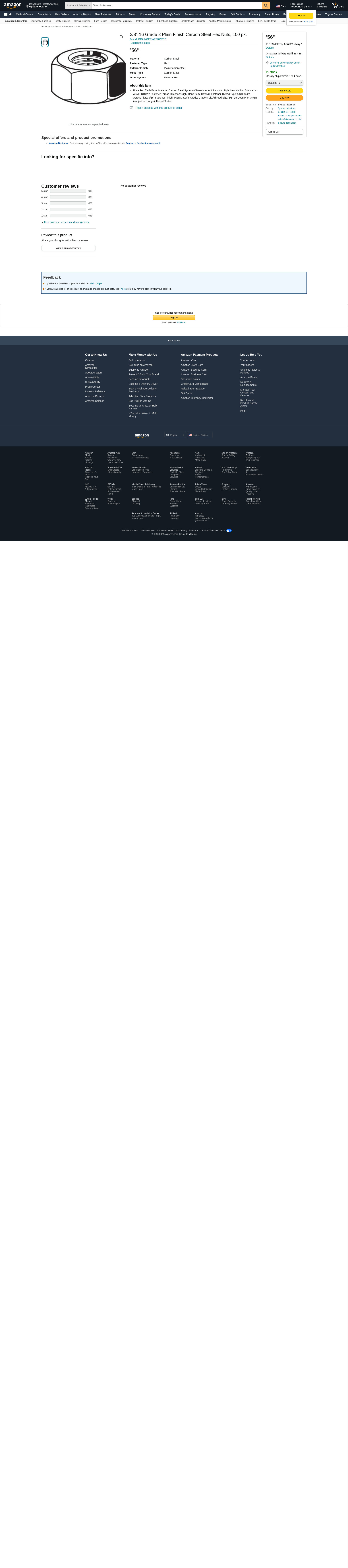'Hex Nut, Nut Style Hex Nut, System of Measurement Inch, Carbon Steel, Material Grade Grade 8, Fastener Finish Plain, Fastener Thread Direction Right Hand, Dia./Thread Size 3/8 In.-16, Fastener Thread Type UNC, Width Across Flats 9/16 In., Nut Height 21/64 In., Nut Standards ASME B18.2.2, Package Quantity 100'