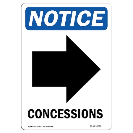 OSHA Notice Sign, Concessions Right Arrow With Symbol, 18in X 12in Rigid Plastic