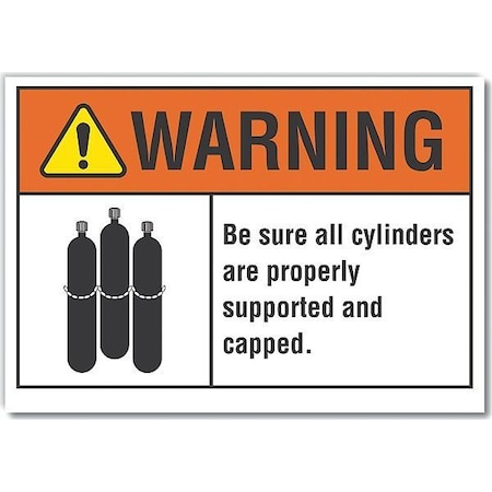 Cylinder Handling Warning Reflective Label, Horizontal Rectangle, Number of Printed Sides 1, English, Sign Format ANSI/OSHA Format, Sign Legend Be Sure Cylinder Is Properly Supported And Capped, Sign Legend Background Color White, Sign Legend Style Symbol and Text