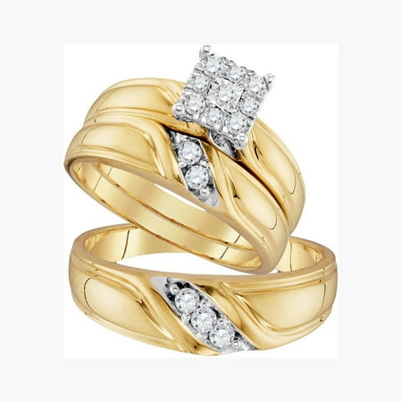 <p><span style="font-size:16px;"><b><u>Description</u></b><br /></span></p> <p><span style="font-size: 14px;">10kt Yellow Gold His & Hers Round Diamond Cluster Matching Bridal Wedding Ring Band Set 1/3 Cttw</span></p> <br /> <p><span style="font-size:16px"><u><b>Gemstone Details</b></u></span></p> <p><span style="font-size:14px">1/3 Carats total weight --- .03 carat center solitaire<br /><br />All diamonds are natural and conflict-free in origin<br /><br /></span></p> <ul type="square"> <b>Round Center Diamond</b> <br /> <li>.03 ct.t.w.</li> <li>I2-I3 clarity</li> <li>J-K color</li> <li>4-prong setting</li> </ul> <br /> <ul> <b>Round Diamond</b> <br /> <li>1/3 ct.t.w.</li> <li>I2-I3 clarity</li> <li>J-K color</li> <li>Pave setting</li> </ul> <br /> <p><span style="font-size:16px"><u><b>Specifications</b></u><br /></span></p> <p><span style="font-size:14px">10kt Yellow Gold<br />7.95 grams (approximately)<br />Ring size selectable</span></p> <p><span style="font-size:11px">Combined diamond weight of 1/3 carats total weight represents a range of 0.30 - 0.36 cts. t.w.</span></p>
