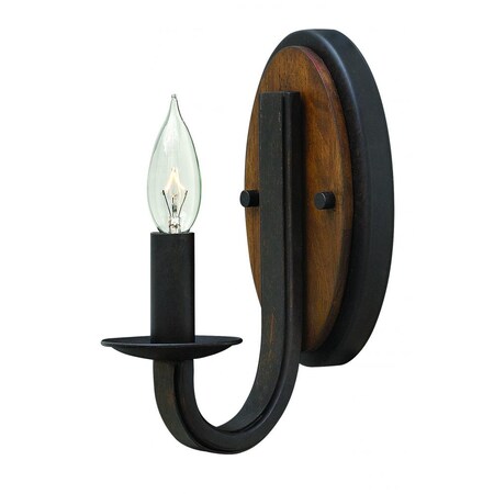 Add a handsome look to your wall with this charming wall sconce full of traditional and rustic grace. Finished in vintage bronze with warm copper highlights and a wood backplate for a natural look. From the Bastille Collection by Fredrick Ramond. Bastille collection wall sconce. From Fredrick Ramond. Vintage bronze finish. Antique copper highlights. Wood details. Maximum 60 watt or equivalent candelabra base bulb (not included). 9 1/2" high. 4 1/2" wide. Extends 6 1/4" from the wall. Backplate is 8 1/2" high, 4 1/2" wide. Mounting point to top of fixture is 4".